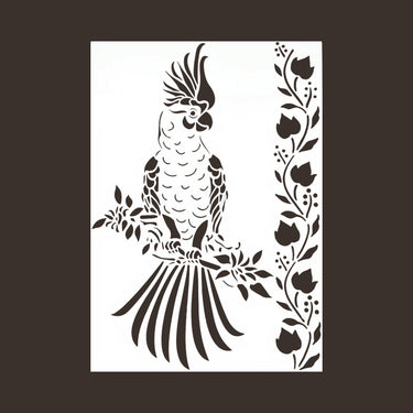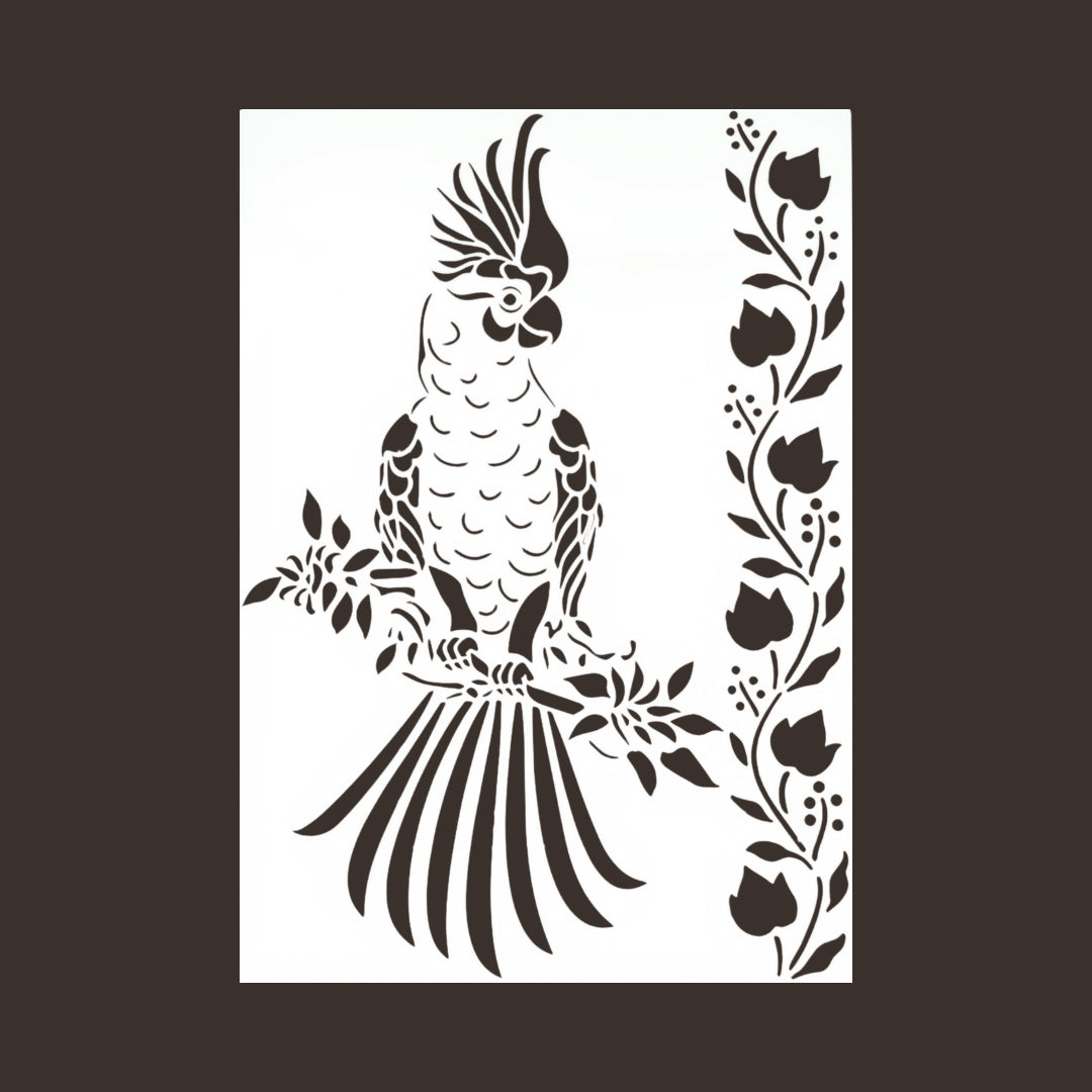 Papukaija aiheinen sapluuna. Koko: A4. Sapluuna on noin 1 mm paksuinen valkoinen muovikalvo, jonka voit aina pestä ja käyttää uudelleen. Pesuun toimii Fusion Mineral Paint sarjan maalien kanssa parhaiten mäntysuopa.