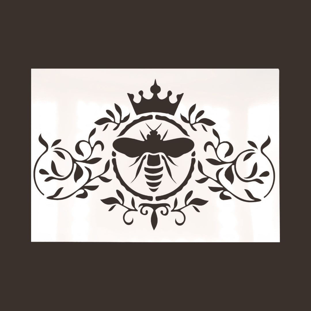 Koristellinen mehiläinen ja kruunu aiheinen sabluuna. Koko: A4. Sapluuna on noin 1 mm paksuinen valkoinen muovikalvo, jonka voit aina pestä ja käyttää uudelleen. Pesuun toimii Fusion Mineral Paint sarjan maalien kanssa parhaiten mäntysuopa.