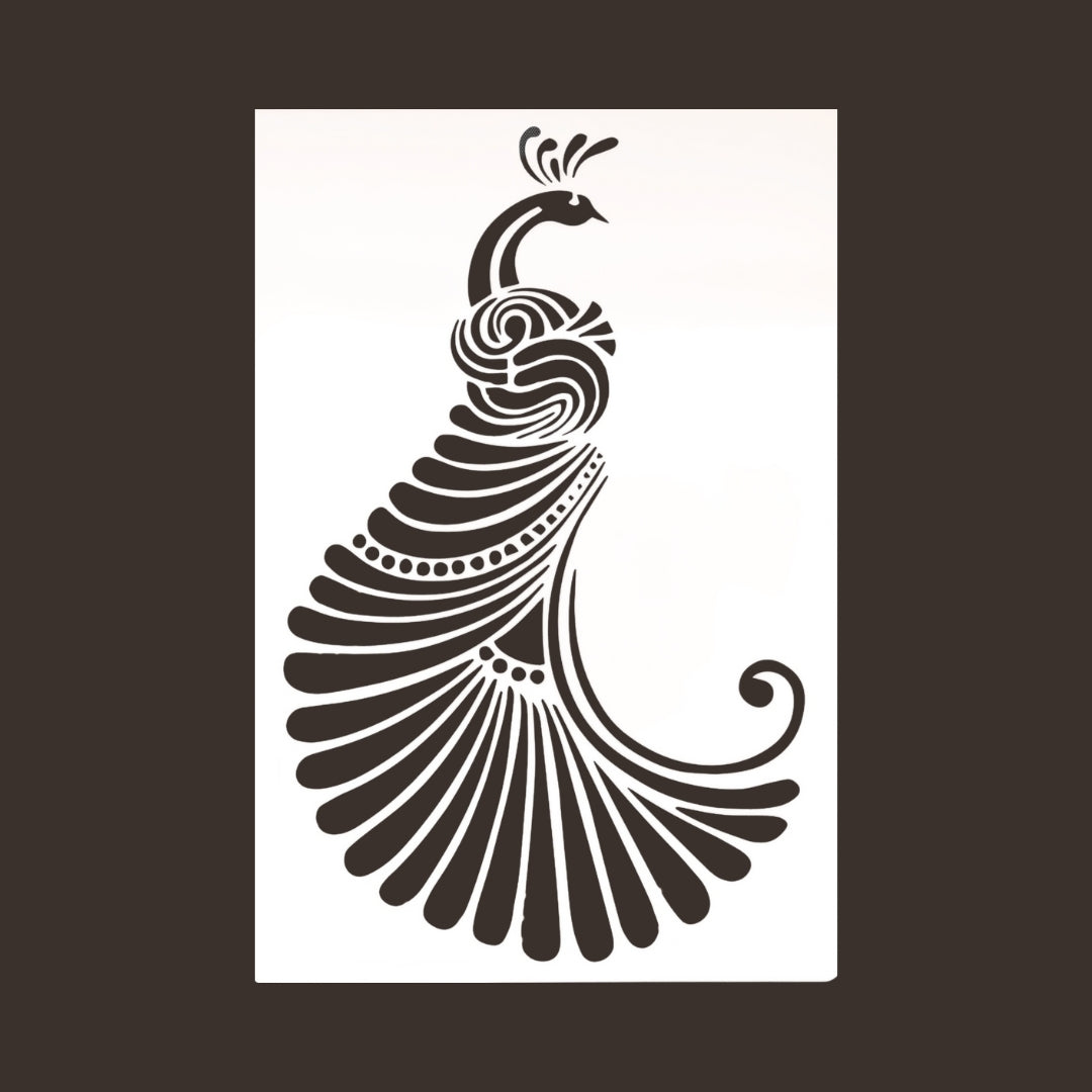 Koristeellinen riikinkukko, peacock aiheinen sabluuna. Koko: 18x26cm. Koristeellinen riikinkukko, peacock aiheinen sabluuna. Koko: A4. Sapluuna on noin 1 mm paksuinen valkoinen muovikalvo, jonka voit aina pestä ja käyttää uudelleen. Pesuun toimii Fusion Mineral Paint sarjan maalien kanssa parhaiten mäntysuopa.