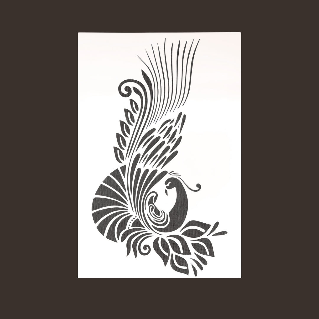 Koristeellinen riikinkukko, peacock aiheinen sabluuna. Koko: 18x26cm. Koristeellinen riikinkukko, peacock aiheinen sabluuna. Koko: A4. Sapluuna on noin 1 mm paksuinen valkoinen muovikalvo, jonka voit aina pestä ja käyttää uudelleen. Pesuun toimii Fusion Mineral Paint sarjan maalien kanssa parhaiten mäntysuopa.