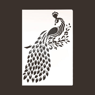 Koristeellinen riikinkukko, peacock aiheinen sabluuna. Koko: 18x26cm. Koristeellinen riikinkukko, peacock aiheinen sabluuna. Koko: A4. Sapluuna on noin 1 mm paksuinen valkoinen muovikalvo, jonka voit aina pestä ja käyttää uudelleen. Pesuun toimii Fusion Mineral Paint sarjan maalien kanssa parhaiten mäntysuopa.
