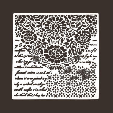 Kukka ornamentti ja vanha kirje- kuvioinen sabluuna kalusteen, seinän, lattian tms. koristeluun. Koko: 30x30cm. Sapluuna on noin 1 mm paksuinen valkoinen muovikalvo, jonka voit aina pestä ja käyttää uudelleen. Pesuun toimii Fusion Mineral Paint sarjan maalien kanssa parhaiten mäntysuopa.