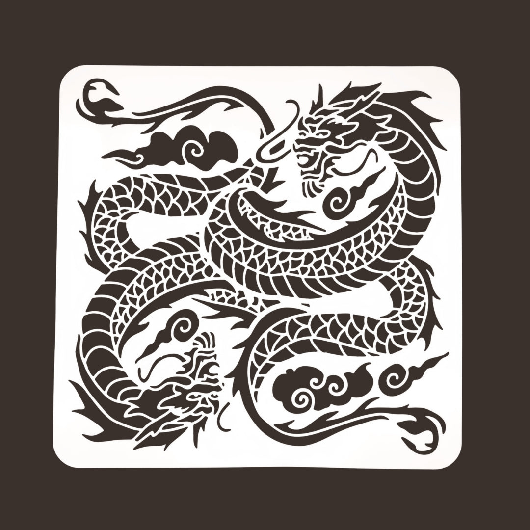 Itämainen lohikäärme- kuvioinen sabluuna kalusteen, seinän, lattian tms. koristeluun. Koko: 30x30cm. Sapluuna on noin 1 mm paksuinen valkoinen muovikalvo, jonka voit aina pestä ja käyttää uudelleen. Pesuun toimii Fusion Mineral Paint sarjan maalien kanssa parhaiten mäntysuopa.