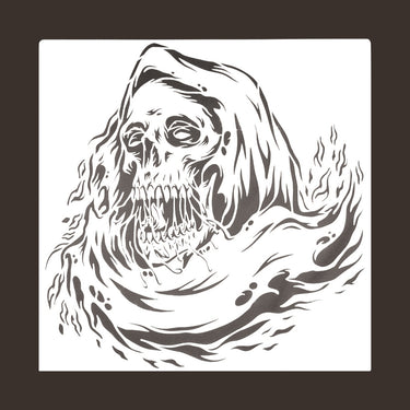 Pääkallo kuvioinen sabluuna kalusteen, seinän, lattian tms. koristeluun. Koko: 30x30cm. Sapluuna on noin 1 mm paksuinen valkoinen muovikalvo, jonka voit aina pestä ja käyttää uudelleen. Pesuun toimii Fusion Mineral Paint sarjan maalien kanssa parhaiten mäntysuopa.
