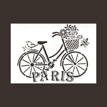 Vanha polkupyörä ja teksti, Paris- aiheinen sapluuna kuviolla. Koko: A4. Sapluuna on noin 1 mm paksuinen valkoinen muovikalvo, jonka voit aina pestä ja käyttää uudelleen. Pesuun toimii Fusion Mineral Paint sarjan maalien kanssa parhaiten mäntysuopa.