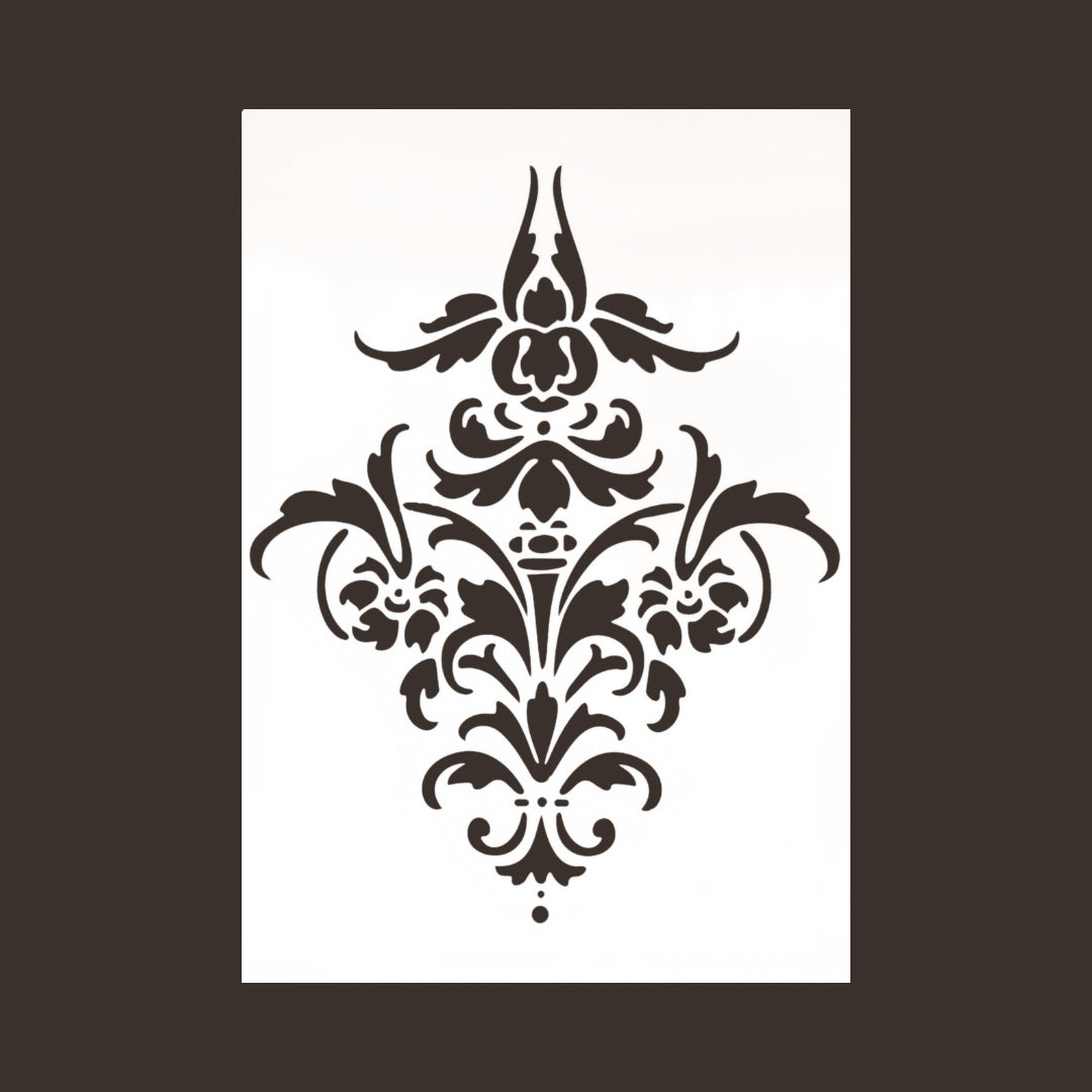 Koristeellinen iso damask aiheinen sapluuna. Koko: A4. Sapluuna on noin 1 mm paksuinen valkoinen muovikalvo, jonka voit aina pestä ja käyttää uudelleen. Pesuun toimii Fusion Mineral Paint sarjan maalien kanssa parhaiten mäntysuopa.