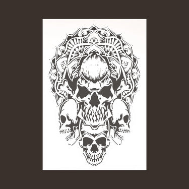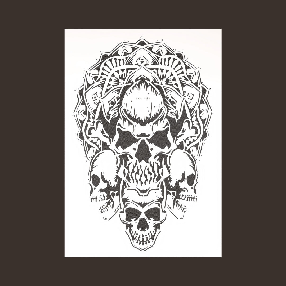 Koristeellinen pääkallo sapluuna, kuvassa 4 kalloa ja mandala. Koko: A4. Sapluuna on noin 1 mm paksuinen valkoinen muovikalvo, jonka voit aina pestä ja käyttää uudelleen. Pesuun toimii Fusion Mineral Paint sarjan maalien kanssa parhaiten mäntysuopa.