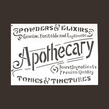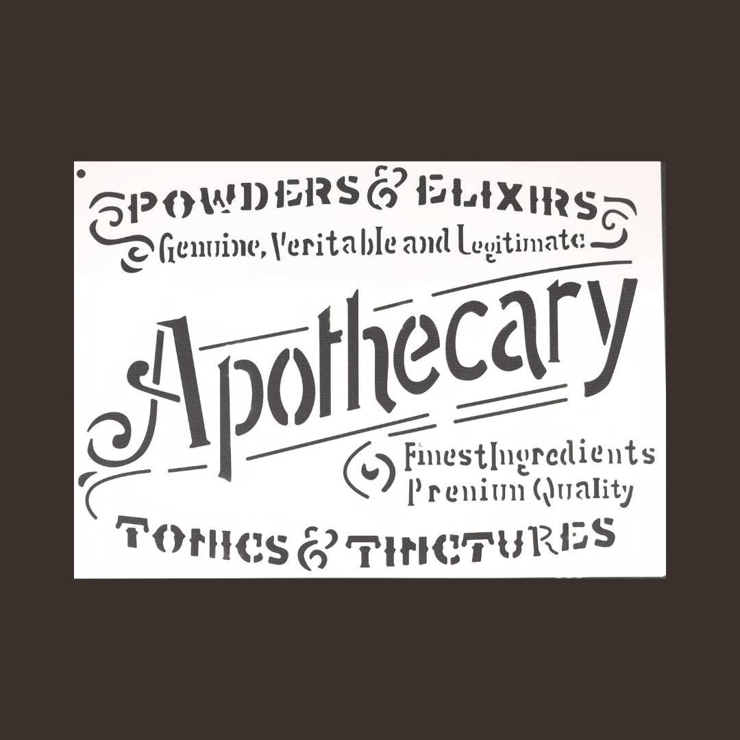 Apteekki aiheinen teksti sabluuna, vanha kyltti. Koko: A4. Sapluuna on noin 1 mm paksuinen valkoinen muovikalvo, jonka voit aina pestä ja käyttää uudelleen. Pesuun toimii Fusion Mineral Paint sarjan maalien kanssa parhaiten mäntysuopa.