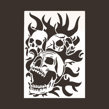 Pääkallo ja halloween aiheinen sabluuna. Koko: 18x26cm. Sapluuna on noin 1 mm paksuinen valkoinen muovikalvo, jonka voit aina pestä ja käyttää uudelleen. Pesuun toimii Fusion Mineral Paint sarjan maalien kanssa parhaiten mäntysuopa.