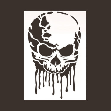 Pääkallo ja halloween aiheinen sabluuna. Koko: 18x26cm. Sapluuna on noin 1 mm paksuinen valkoinen muovikalvo, jonka voit aina pestä ja käyttää uudelleen. Pesuun toimii Fusion Mineral Paint sarjan maalien kanssa parhaiten mäntysuopa.