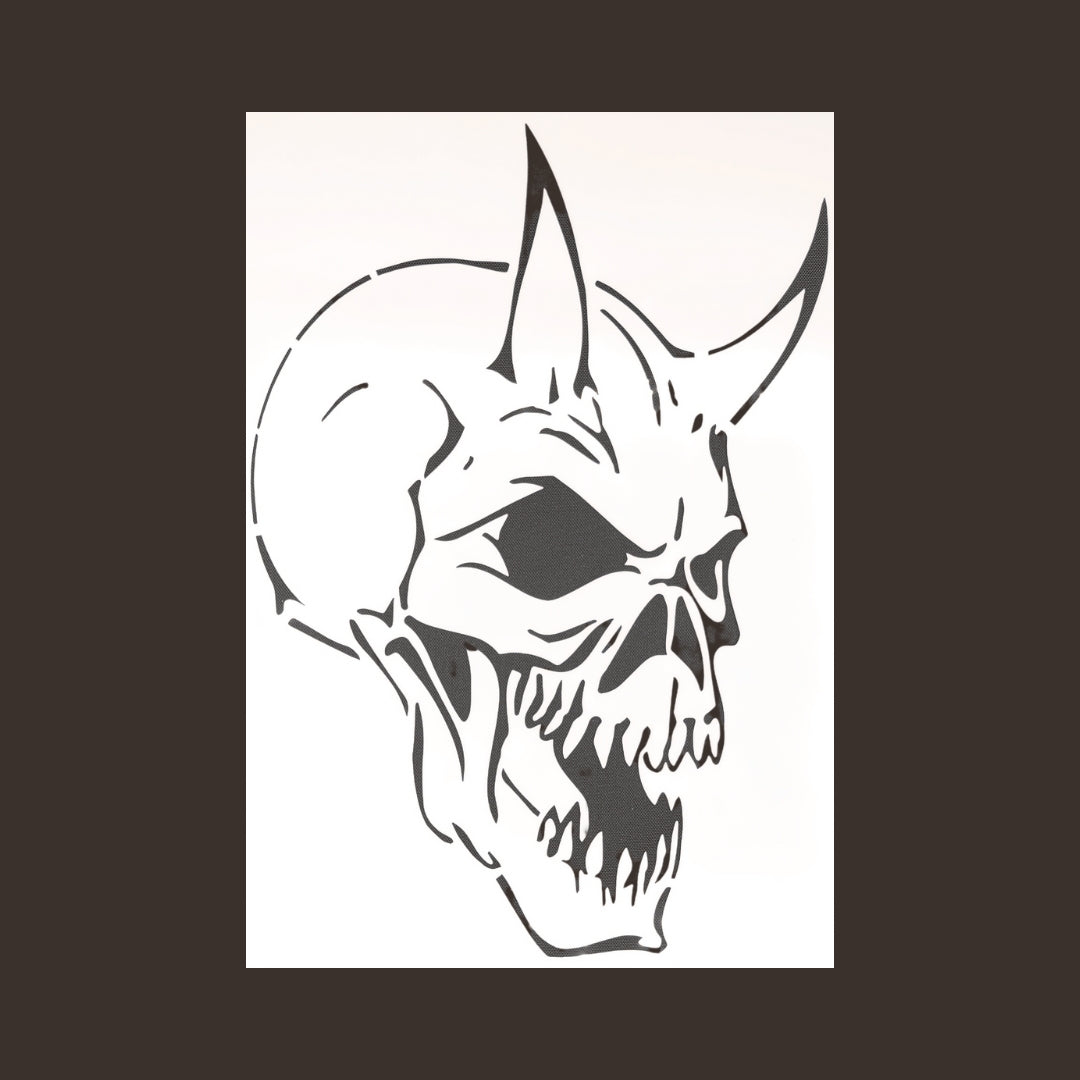 Pääkallo ja halloween aiheinen sabluuna. Koko: 18x26cm. Sapluuna on noin 1 mm paksuinen valkoinen muovikalvo, jonka voit aina pestä ja käyttää uudelleen. Pesuun toimii Fusion Mineral Paint sarjan maalien kanssa parhaiten mäntysuopa.