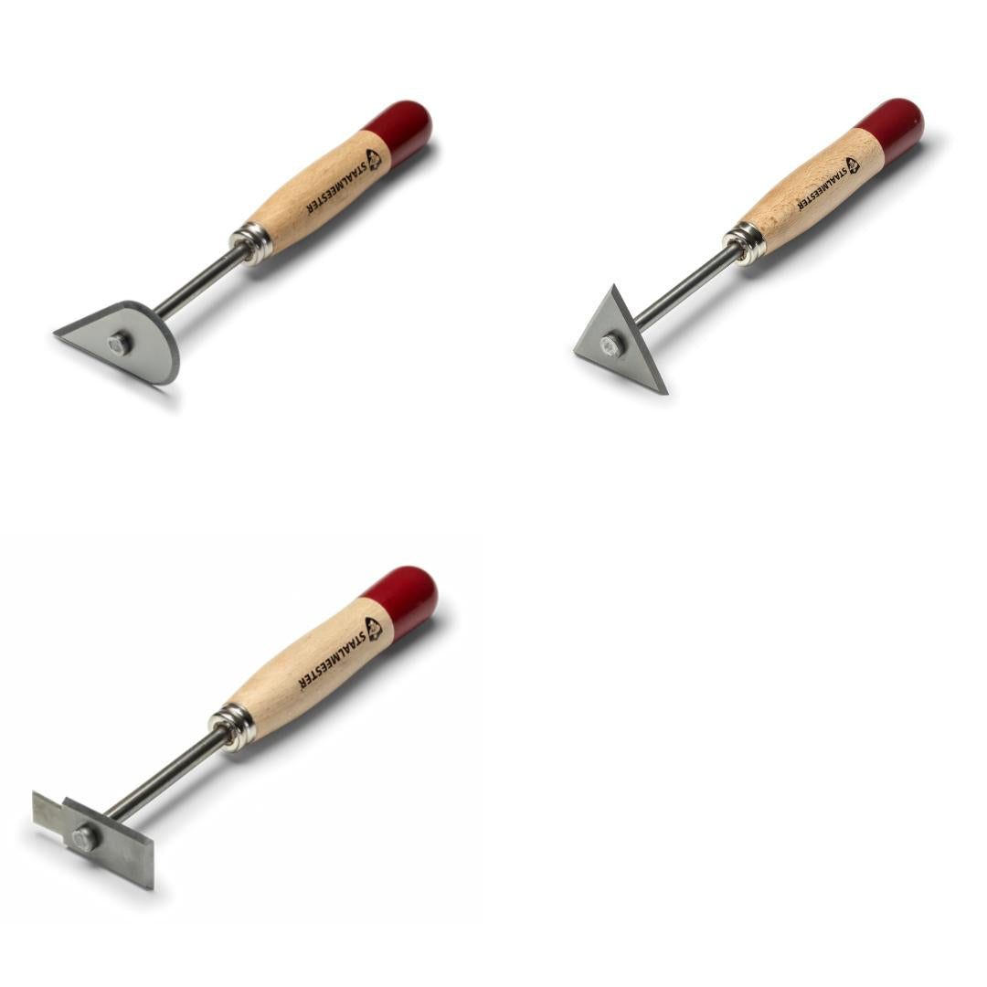 FSC-sertifioitua lakattua pyökkiä oleva laadukas hollantilainen Staalmeester- kaavin. Kaapimia on kolmea mallia. Kolmion muotoinen suorille, tasaisille pinnoille, pisaran muotoinen urille ja koristeille sekä profiili, jossa on suorakaiteen muotoinen leveämpi ja kapeampi pää.