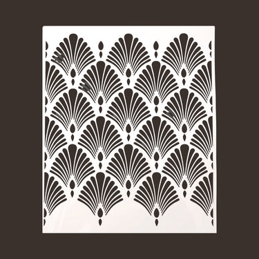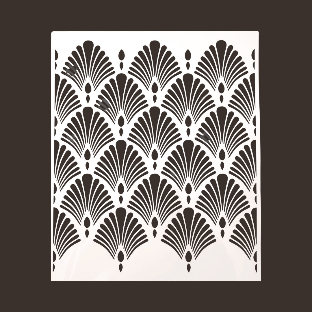 Art Deco kuvioinen koristeellinen viuhka sabluuna kalusteen, seinän, lattian tms. koristeluun. Koko: noin 30x36cm. Sapluuna on noin 1 mm paksuinen valkoinen muovikalvo, jonka voit aina pestä ja käyttää uudelleen. Pesuun toimii Fusion Mineral Paint sarjan maalien kanssa parhaiten mäntysuopa.