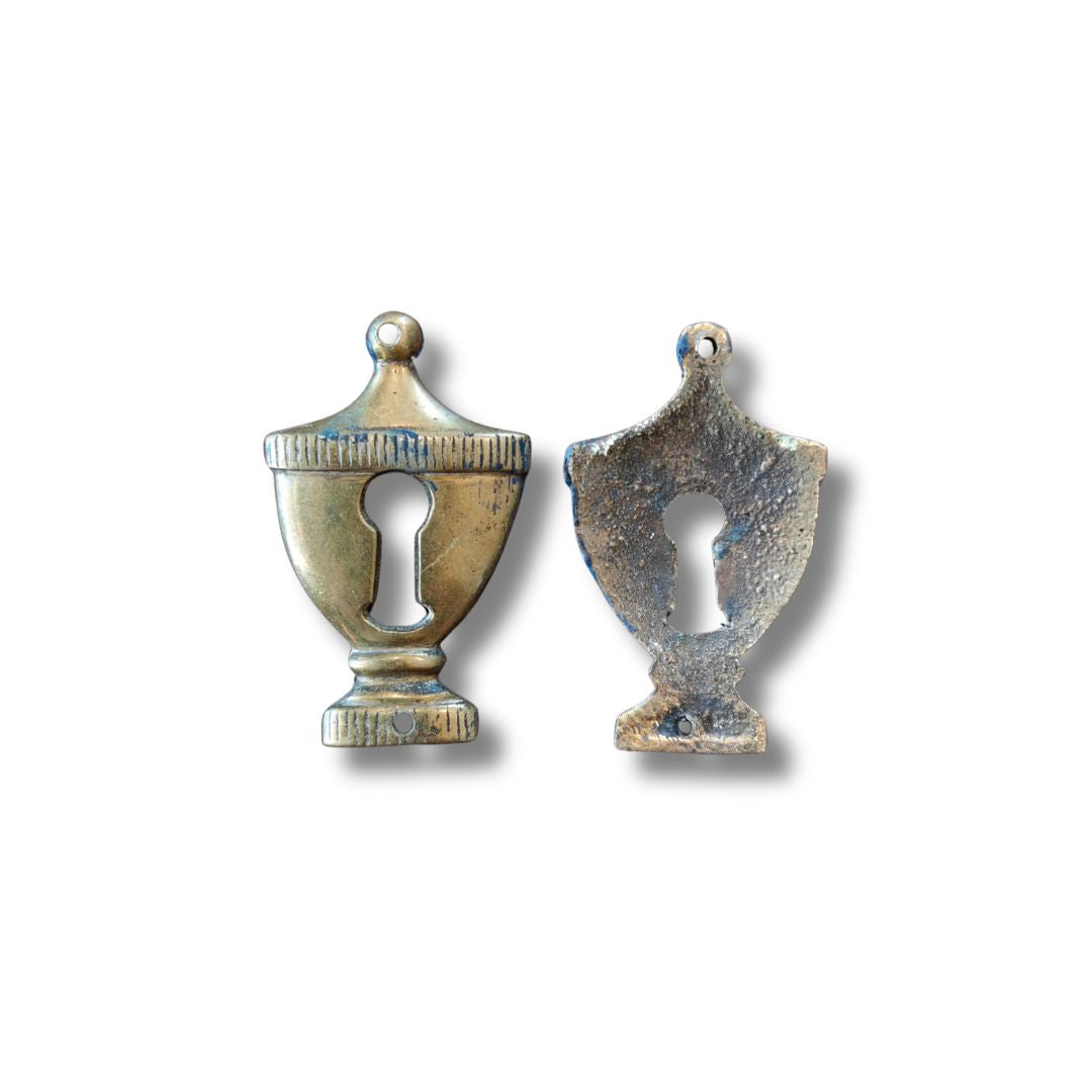 Tuo ripaus klassista eleganssia huonekalullesi tällä upealla, uurnanmuotoisella kierrätys avainkilvellä. Tämä messinkinen avainkilpi on uskollinen kustavilaiselle tyylille, joka tunnetaan symmetriasta ja hienostuneista antiikin vaikutteista. Se on täydellinen valinta, kun haluat palauttaa vanhan lipaston loiston tai antaa uudelle kalusteelle historiallisen sielun.